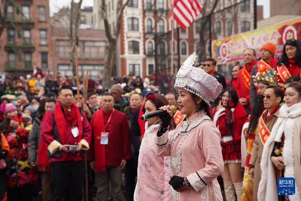2月17日,歌手在美國紐約中國城的廟會現(xiàn)場演唱歌曲。