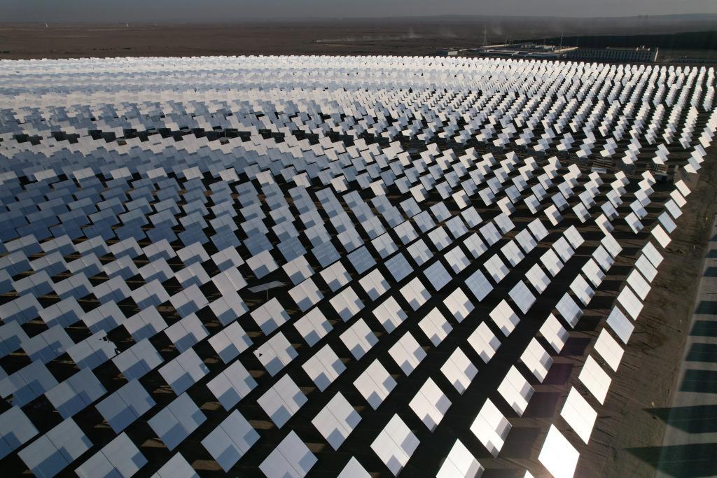 在中國(guó)西北戈壁的無(wú)垠荒漠中,2.5萬(wàn)余面定日鏡向心分布。鏡場(chǎng)的總反射面積達(dá)到77萬(wàn)平方米,相當(dāng)于108個(gè)標(biāo)準(zhǔn)足球場(chǎng)。從空中俯瞰,宛若一朵盛開(kāi)的巨型向日葵。