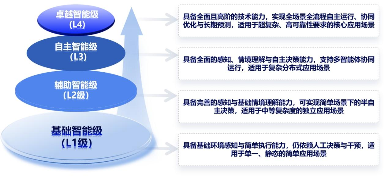 物聯(lián)網(wǎng)智能體評估體系涵蓋通用基準(zhǔn)、技術(shù)能力、應(yīng)用能力三大維度,共43項指標(biāo);提出基礎(chǔ)智能(L1)、輔助智能(L2)、自主智能(L3)、卓越智能(L4)四級分類體系,科學(xué)反映智能體在不同場景下的成熟度與效能水平。