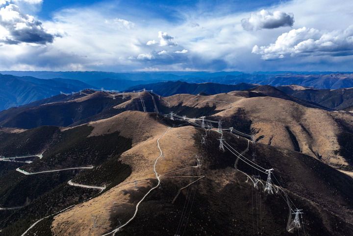 金沙江上游—湖北±800千伏特高壓直流輸電工程四川段線路俯瞰。(江偉攝)