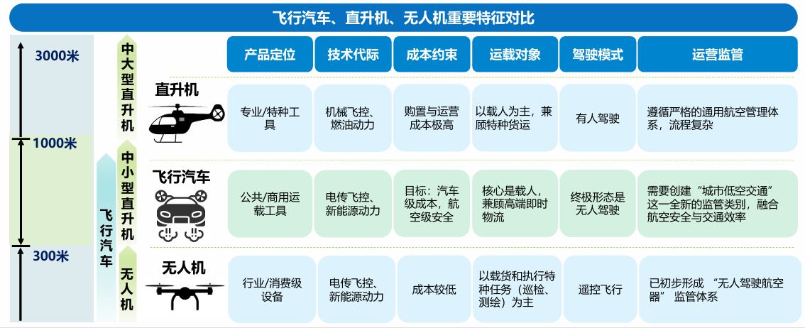報告結合最新行業(yè)發(fā)展態(tài)勢、技術研討成果及典型飛行器特征對比,給出精準界定。這一定義既明確了其“電動化、垂直起降、空地協(xié)同”的核心屬性,也厘清了與無人機、直升機的本質區(qū)別,為行業(yè)凝聚發(fā)展共識、統(tǒng)一推進方向提供了重要基礎。