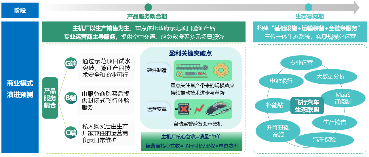 關鍵判斷六:飛行汽車商業(yè)模式將沿“耦合產品服務→閉環(huán)生態(tài)”兩階段演化,最終通過共享運營和平臺化服務,構建可持續(xù)的立體出行價值網絡。