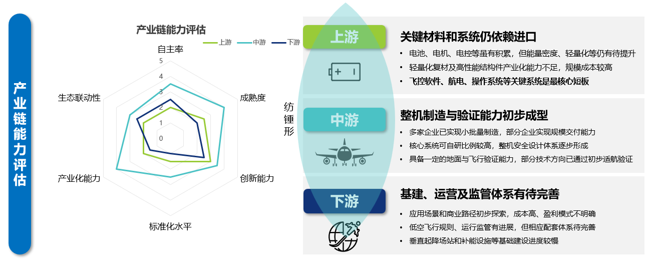 賦能生態(tài):以核心層的航空級自主可控能力為基礎,向外延伸補強支撐層的政策、空域、數(shù)字與基礎設施保障能力,并在生態(tài)層逐步形成適航、空管、運營與服務協(xié)同運行的完整產業(yè)生態(tài)。