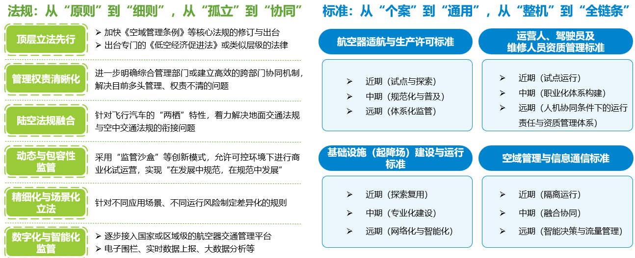 關鍵判斷八:未來飛行汽車法規(guī)將從“原則性許可”走向“以風險為導向的精細化管理”,構建多部門協(xié)同的綜合性法規(guī)體系;標準將從“個案審定”走向“可復用的通用規(guī)范,建立覆蓋全生命周期的分級分類標準簇”。
