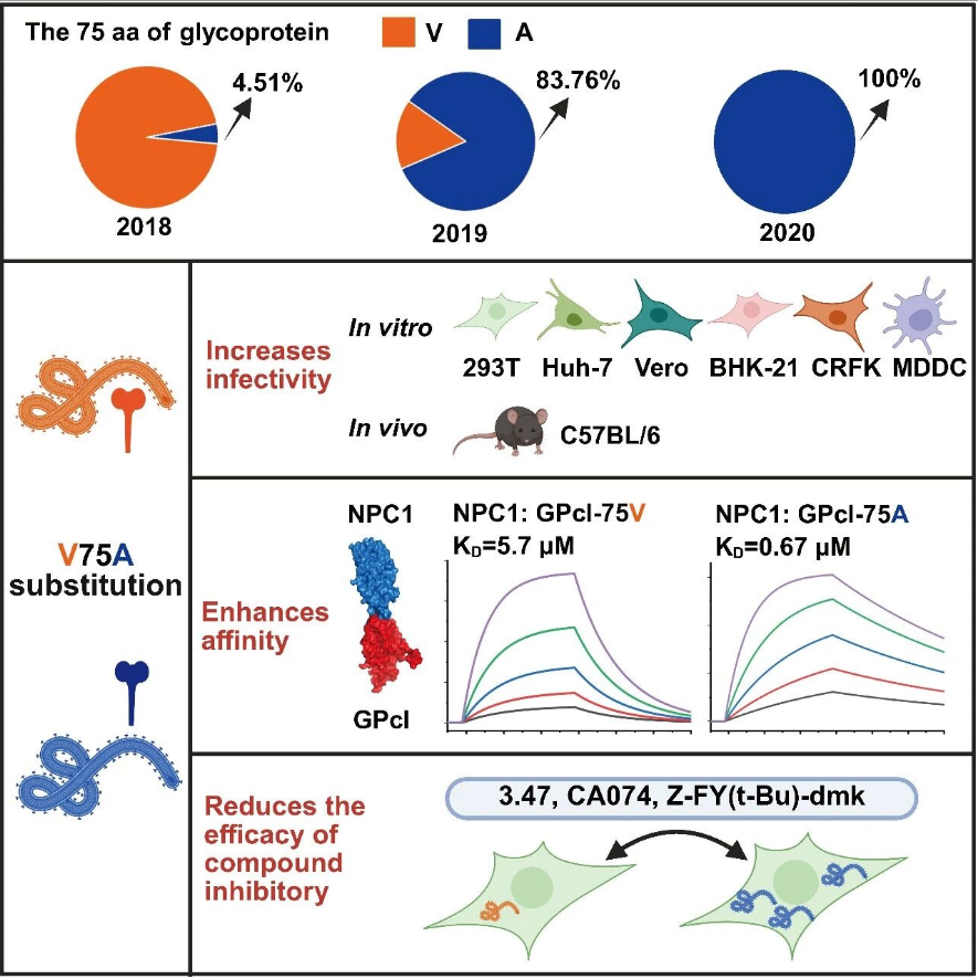 研究團(tuán)隊(duì)首先對(duì)480條EBOV全基因組進(jìn)行分析,發(fā)現(xiàn)攜帶糖蛋白GP-V75A突變的毒株在疫情早期出現(xiàn),之后迅速取代原始毒株,其流行趨勢(shì)與病例激增高度重合,提示該突變可能提高了病毒的傳播優(yōu)勢(shì)。