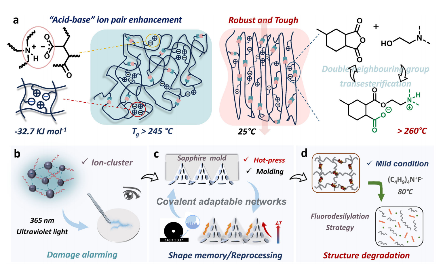 汪懷遠(yuǎn)教授團(tuán)隊(duì)從分子設(shè)計(jì)源頭入手,在傳統(tǒng)環(huán)氧樹脂的剛性網(wǎng)絡(luò)中巧妙地植入了可逆的“酸堿離子對(duì)”。這些離子對(duì)在材料中扮演著雙重角色,既是吸收沖擊能量的“微型減震器”,又是能在高溫下啟動(dòng)鍵位重組的“智能催化劑”。這種設(shè)計(jì)使新材料在保持超高強(qiáng)度(78兆帕)和耐熱性(玻璃化轉(zhuǎn)變溫度大于245攝氏度)的同時(shí),斷裂韌性達(dá)到了8.2兆焦耳每立方米。相比市售高端環(huán)氧樹脂材料,新材料的耐熱性提高了約15%,而斷裂韌性則提升了近3倍。在保持這些優(yōu)異性能的同時(shí),新材料還具備了傳統(tǒng)環(huán)氧樹脂所缺乏的自修復(fù)能力和可回收性。