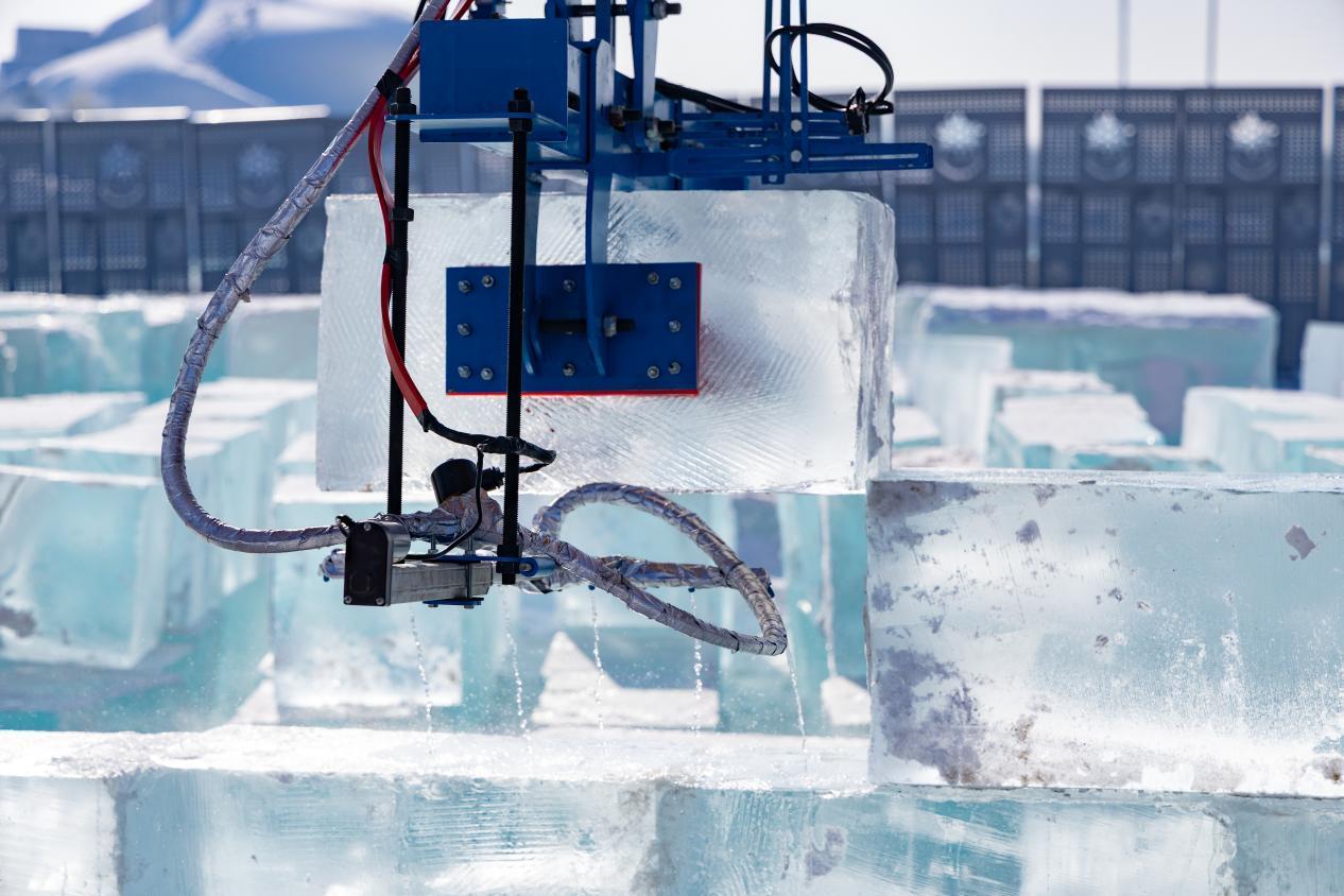 搭建機(jī)器人的作業(yè)流程全程自動化:自動上料設(shè)備將冰塊輸送至提升機(jī)構(gòu),提升機(jī)構(gòu)將冰塊精準(zhǔn)提升至指定高度,抓取機(jī)構(gòu)穩(wěn)穩(wěn)夾住冰塊后,打磨機(jī)械手對冰塊進(jìn)行精細(xì)打磨,隨后噴淋裝置進(jìn)行處理,最后夾爪將冰塊精準(zhǔn)放置到搭建位置,整個過程無需人工干預(yù),實現(xiàn)了“無人化搭建”。