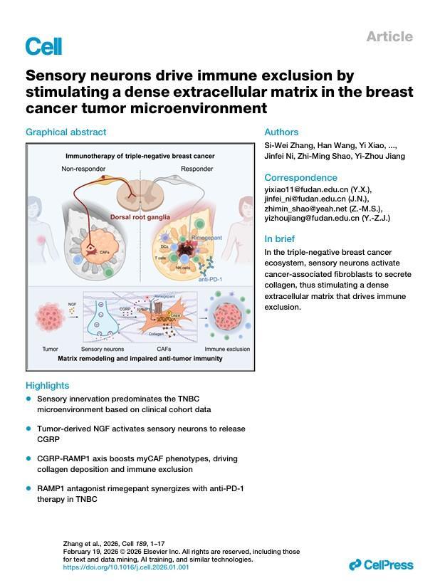 復(fù)旦大學(xué)附屬腫瘤醫(yī)院教授邵志敏、江一舟領(lǐng)銜的團(tuán)隊(duì),聯(lián)合復(fù)旦大學(xué)腦科學(xué)轉(zhuǎn)化研究院教授倪金飛團(tuán)隊(duì),揭示腫瘤中的感覺神經(jīng)是導(dǎo)致部分三陰性乳腺癌患者免疫治療在短期內(nèi)耐藥的“元兇”,并發(fā)現(xiàn)一種用于治療偏頭痛的藥物可用于增敏免疫治療。2月6日,相關(guān)研究成果發(fā)表于《細(xì)胞》。