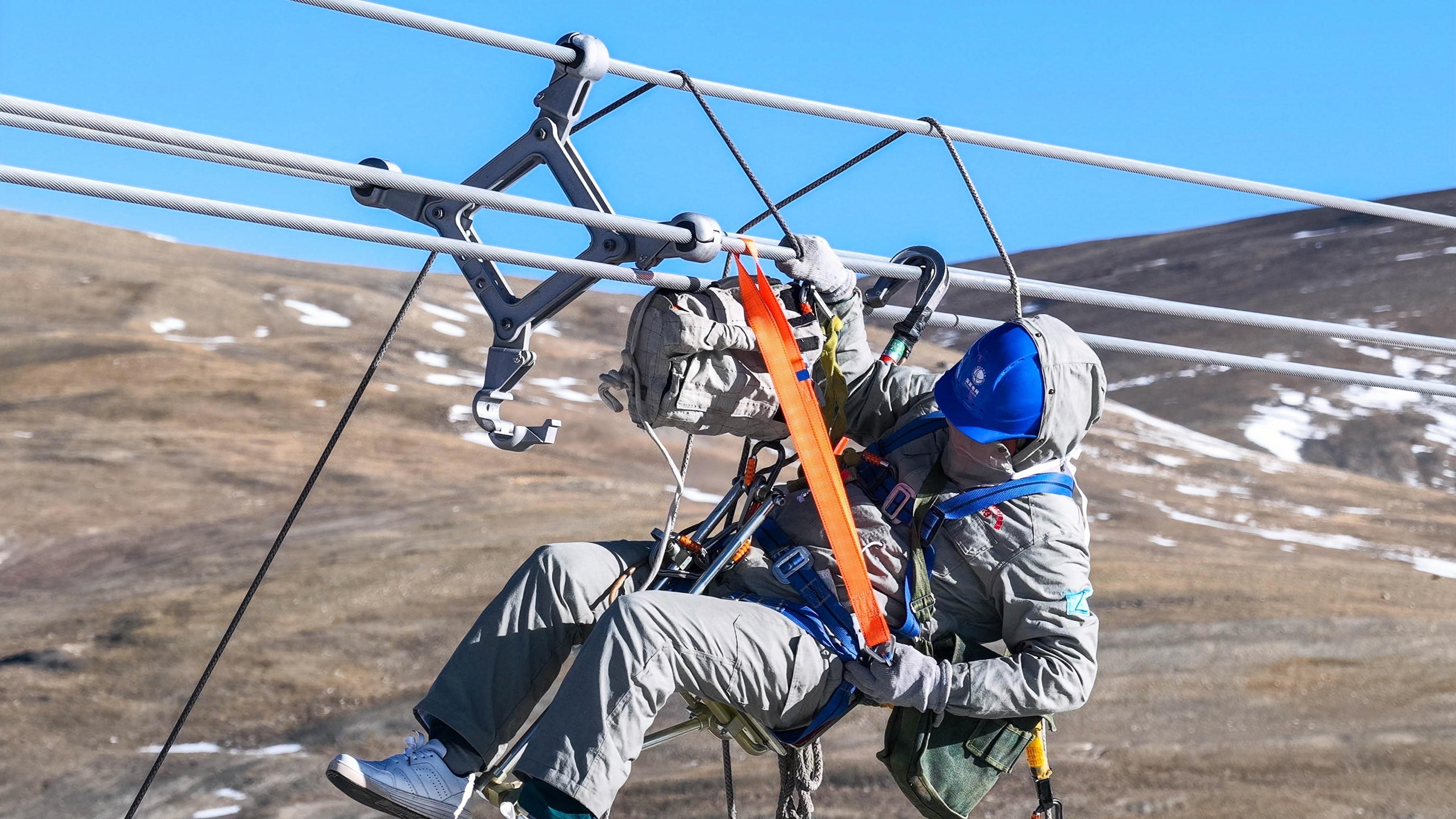 ±400千伏青藏聯(lián)網(wǎng)工程是我國首條進入西藏的“電力天路”,是連接青藏的“能源大動脈”。帶電作業(yè)現(xiàn)場空氣含氧量僅為平原地區(qū)的40%,最低氣溫達零下28攝氏度。國網(wǎng)青海超高壓公司采用“無人機+電動升降機”組合技術(shù),無人機先精準拋掛絕緣繩索,等電位人員乘坐電動升降機升至30多米的高空作業(yè)點開展作業(yè),有效規(guī)避帶電作業(yè)人員攀爬鐵塔時的高原反應(yīng)風(fēng)險。
