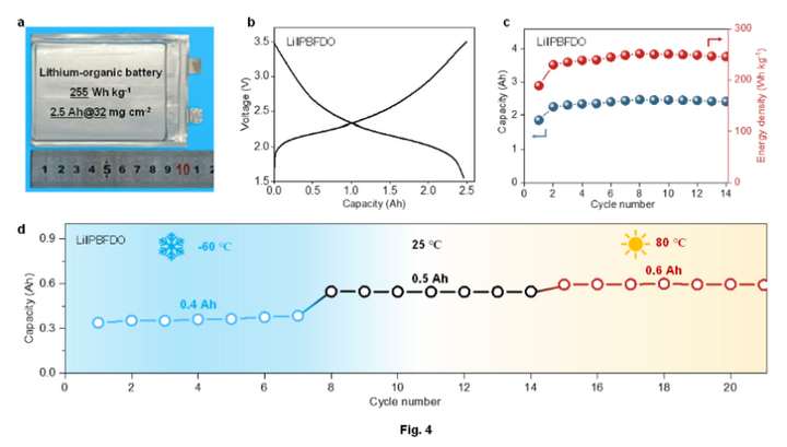 基于此材料,團(tuán)隊(duì)制備出一款能量密度超過(guò)250瓦時(shí)/公斤的有機(jī)軟包電池,這一數(shù)值已超越目前廣泛使用的磷酸鐵鋰電池。這款電池展現(xiàn)出卓越的溫度適應(yīng)能力,不僅能在-70℃到80℃的溫度下正常工作,還兼具良好的柔韌性與安全性。