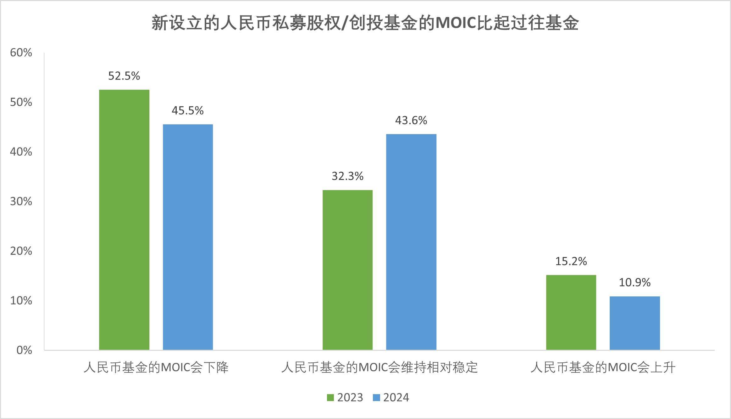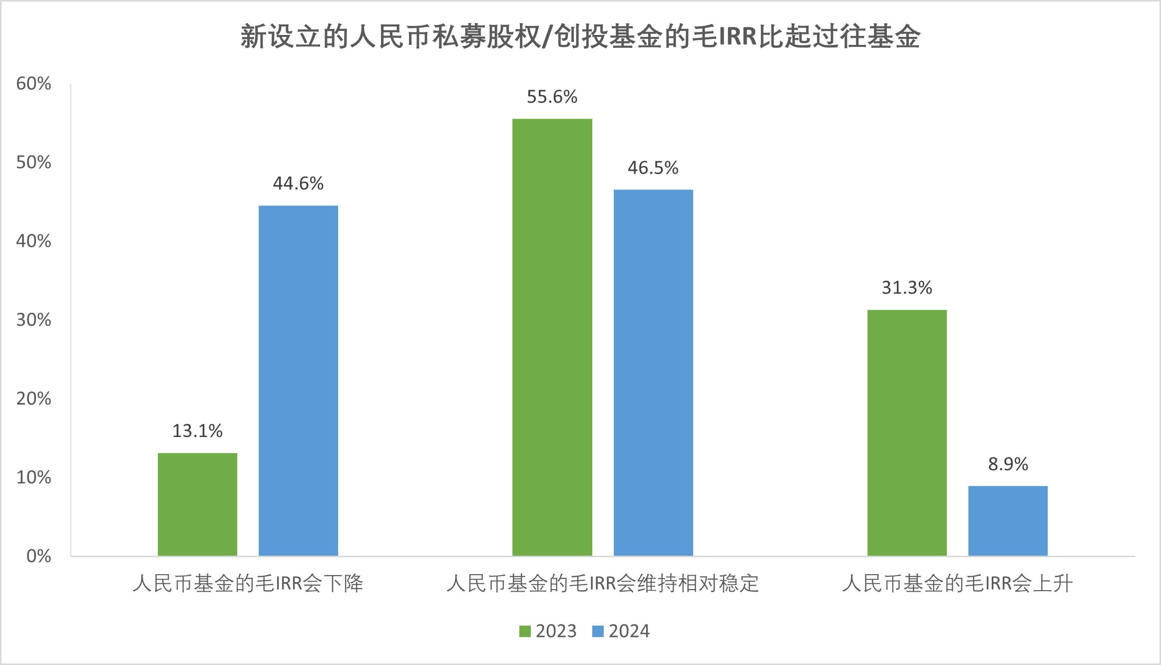 調(diào)研結(jié)果顯示,IRR主要集中在5%-20%區(qū)間(63.4%),仍有16.8%的機構(gòu)IRR低于5%,人民幣基金業(yè)績分化明顯;44.6%預(yù)測新基金IRR將下降。