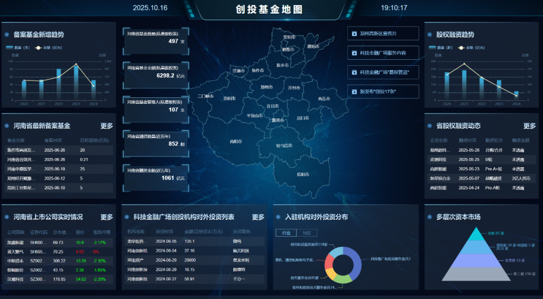 可視化呈現(xiàn)全國(guó)主流創(chuàng)投基金的分布情況、投資偏好與階段標(biāo)簽,支持按地域、賽道、投資階段進(jìn)行篩選,幫助科技企業(yè)精準(zhǔn)定位“對(duì)的資本”,并展示近五年河南省新增備案基金數(shù)量及規(guī)模、股權(quán)融資趨勢(shì)以及輿情監(jiān)控。