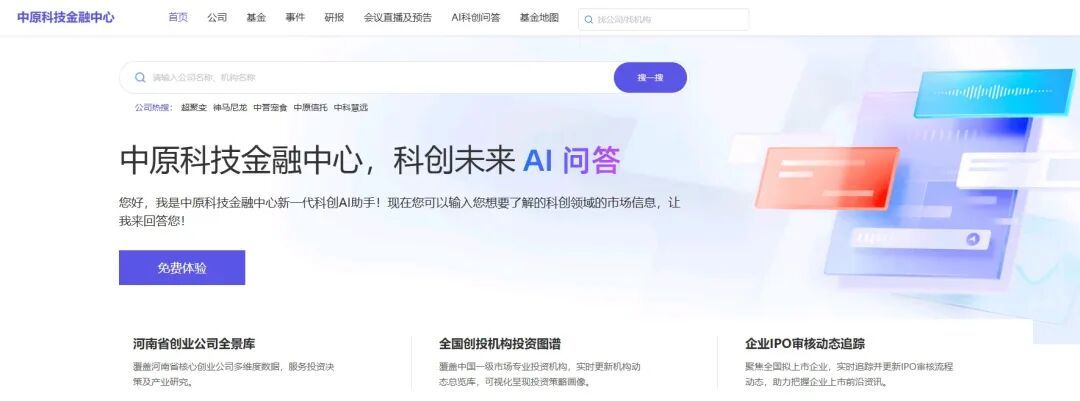 作為垂直領(lǐng)域的大模型平臺(tái),“中原科技金融中心”聚焦科技企業(yè)成長(zhǎng)全周期與金融服務(wù)全流程。該平臺(tái)集成企業(yè)庫(kù)、創(chuàng)投基金資源、行業(yè)研報(bào)、融資數(shù)據(jù)、會(huì)議服務(wù)等多維功能模塊,通過(guò)深度學(xué)習(xí)政策文件、企業(yè)數(shù)據(jù)與創(chuàng)投基金信息,構(gòu)建起懂科技、懂金融、懂政策的“超級(jí)顧問(wèn)”能力,致力于為河南省乃至全國(guó)的科創(chuàng)企業(yè)提供從0到IPO全生命周期一站式服務(wù)。
