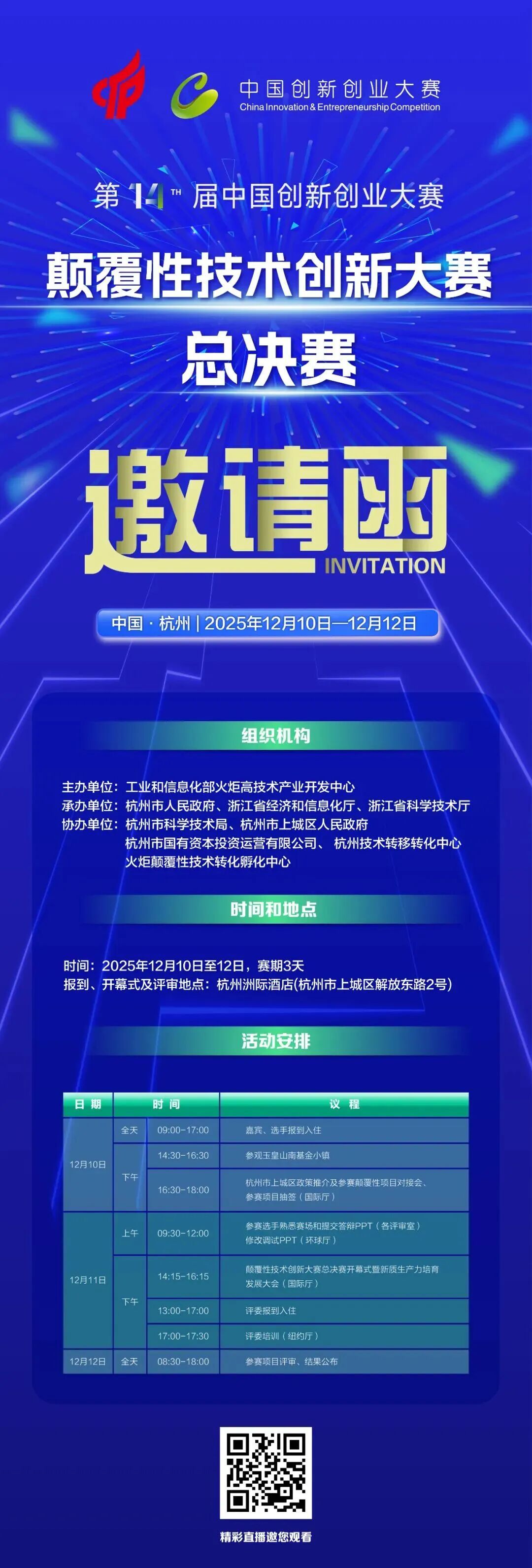 12月10日至12日,第十四屆中國創(chuàng)新創(chuàng)業(yè)大賽顛覆性技術(shù)創(chuàng)新大賽總決賽暨新質(zhì)生產(chǎn)力培育發(fā)展大會將在杭州市上城區(qū)舉行。