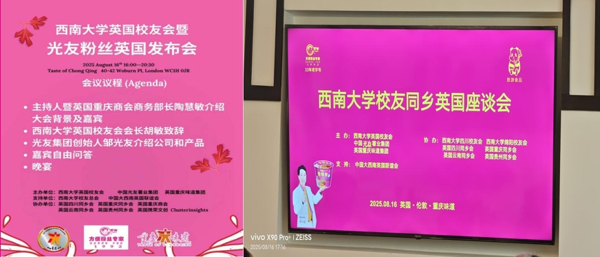 8月16日,光友粉絲團(tuán)在倫敦重慶味道召開《西南大學(xué)英國(guó)校友會(huì)暨光友粉絲英國(guó)發(fā)布會(huì)》,來自中英兩國(guó)的西南大學(xué)校友及川渝云貴等企業(yè)家、科學(xué)家歡聚一堂,共敘鄉(xiāng)情、推動(dòng)光友粉絲在英國(guó)大發(fā)展。