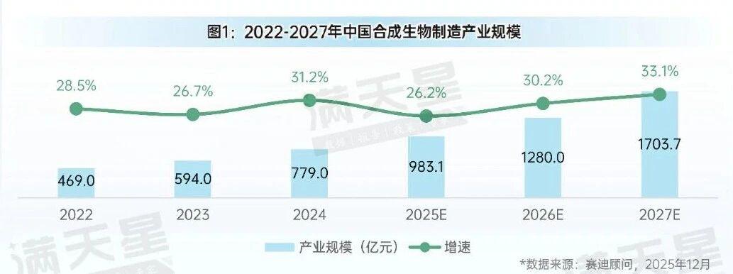 近日,賽迪顧問發(fā)布的《中國合成生物制造產(chǎn)業(yè)》研究指出,中國合成生物制造產(chǎn)業(yè)正處于高速增長期,2024年規(guī)模已接近800億元,2025年有望逼近1000億元,較2024年增長26.2%,近3年增速均維持在25%以上。在政策紅利與技術突破的雙重驅(qū)動下,中國合成生物產(chǎn)業(yè)化落地加速,疊加市場認可度提升,未來增長空間廣闊。