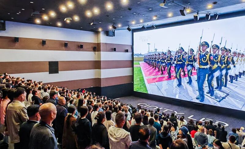 隨著大會(huì)直播畫面的切換,天安門廣場(chǎng)上,五星紅旗冉冉升起,現(xiàn)場(chǎng)的觀眾不約而同地站起身來(lái),目光緊緊跟隨那一抹鮮艷的紅色。鏗鏘有力的正步聲仿佛穿透了屏幕,傳入每個(gè)人的耳中,英姿勃發(fā)的隊(duì)伍整齊劃一,如同一道鋼鐵長(zhǎng)城。當(dāng)國(guó)之重器一一亮相時(shí),整個(gè)影廳都沸騰了。