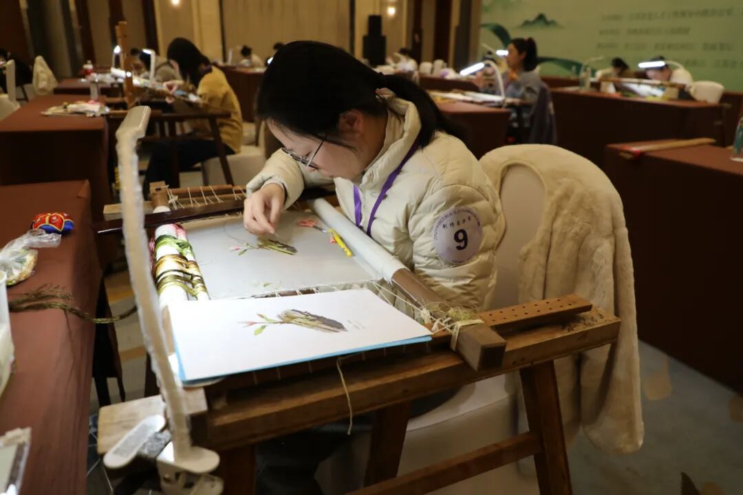 比賽指定圖樣《新生》以枯木新芽為畫面,選手們靈活運(yùn)用平針、滾針等蘇繡核心針法,在絲理排布、針腳層次、色彩暈染上精雕細(xì)琢,既堅(jiān)守非遺技藝傳承本真,又通過針法創(chuàng)新賦予圖樣鮮活意境,盡顯傳統(tǒng)工藝的精湛與當(dāng)代創(chuàng)造力。