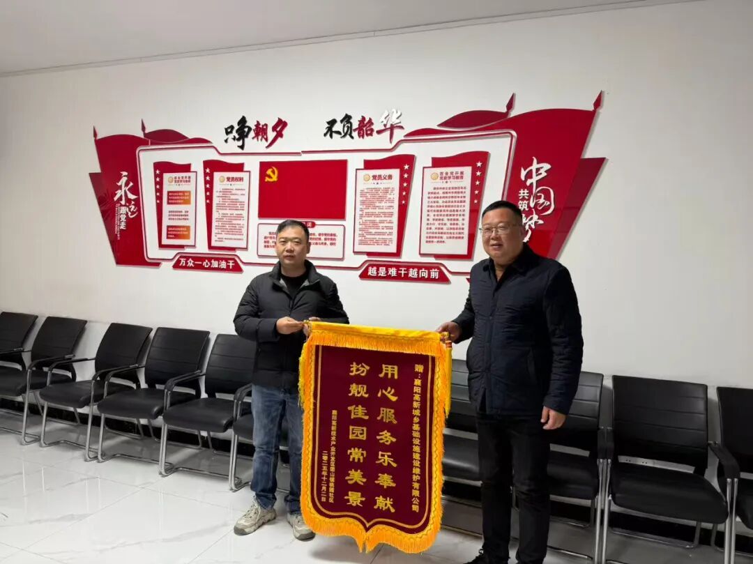 12月4日,桃園社區(qū)黨委書(shū)記馮燕輝前往襄陽(yáng)市高新區(qū)城鄉(xiāng)基礎(chǔ)設(shè)施建設(shè)維護(hù)有限公司贈(zèng)送錦旗,感謝該公司在黨建引領(lǐng)小區(qū)綜合治理中的大力支持與無(wú)私幫扶。