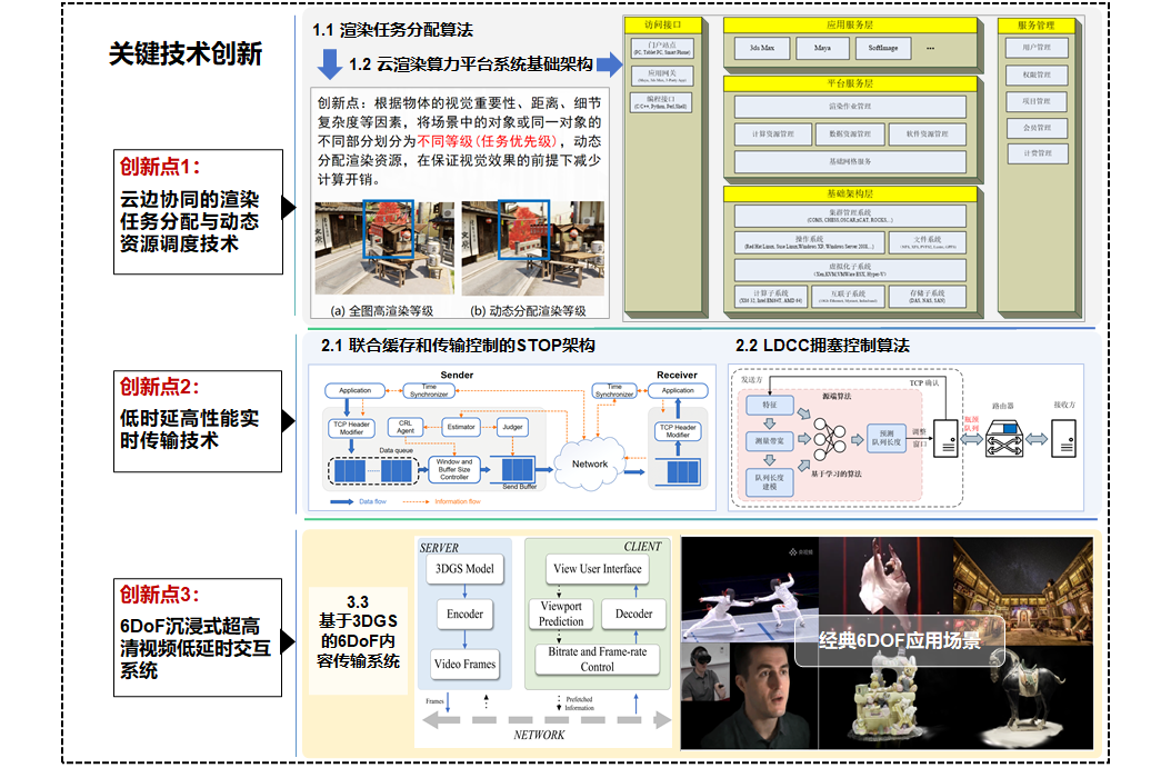 該項(xiàng)目提出了云邊協(xié)同的細(xì)粒度分布式云渲染任務(wù)分配方法和資源調(diào)度技術(shù),研發(fā)的渲染平臺(tái),支持實(shí)時(shí)渲染及離線渲染功能,可分幀、分節(jié)點(diǎn)進(jìn)行分布式、分等級(jí)渲染。同時(shí),提出了低時(shí)延共性能實(shí)時(shí)傳輸技術(shù)和研發(fā)了虛擬直播應(yīng)用系統(tǒng),對(duì)比現(xiàn)有SOTA方案,渲染與傳輸時(shí)延明顯下降。項(xiàng)目還提出了基于3D高斯的6DoF沉浸式內(nèi)容生成、交互與傳輸系統(tǒng),包括動(dòng)態(tài)幀率與編碼、視口預(yù)測(cè)與糾正機(jī)制、云邊協(xié)同的低時(shí)延交互等技術(shù),提升QoE,可支持手機(jī)、平板和電腦等終端。