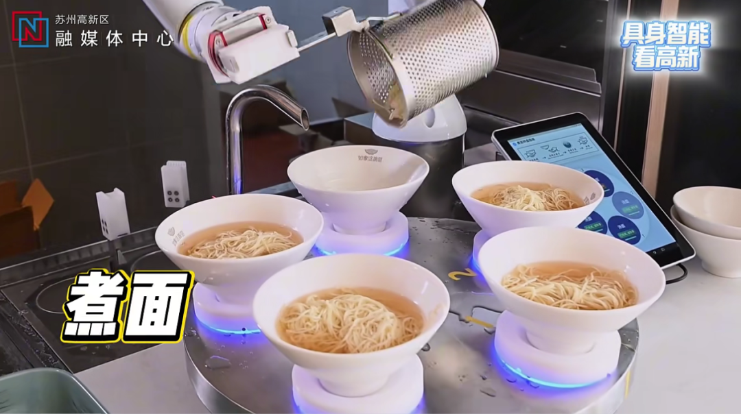 “取面、投面、煮面、加湯、取餐提醒”,云跡煮面機器人實現(xiàn)全流程包辦。客人僅需完成放碗點單、取餐兩步操作,最快54秒的時間,一碗熱氣騰騰、香氣四溢的面條出鍋。同時借助AI溫控與軌跡優(yōu)化技術(shù),精準維持面條口感與適宜溫度,相當于1-2名熟練廚師的工作量。
