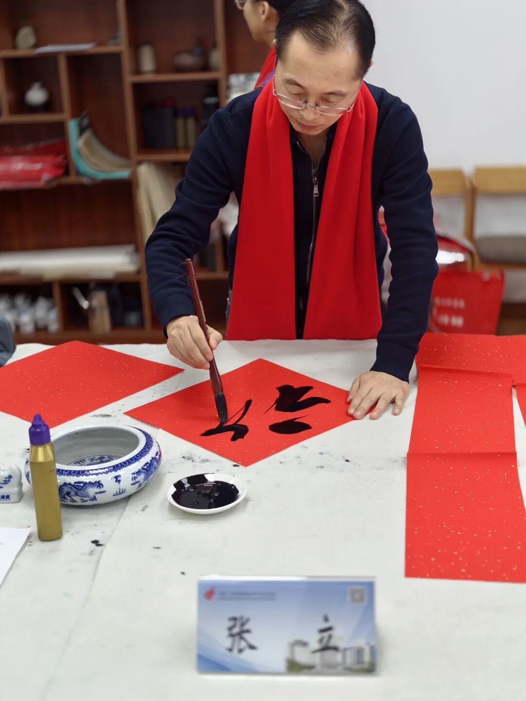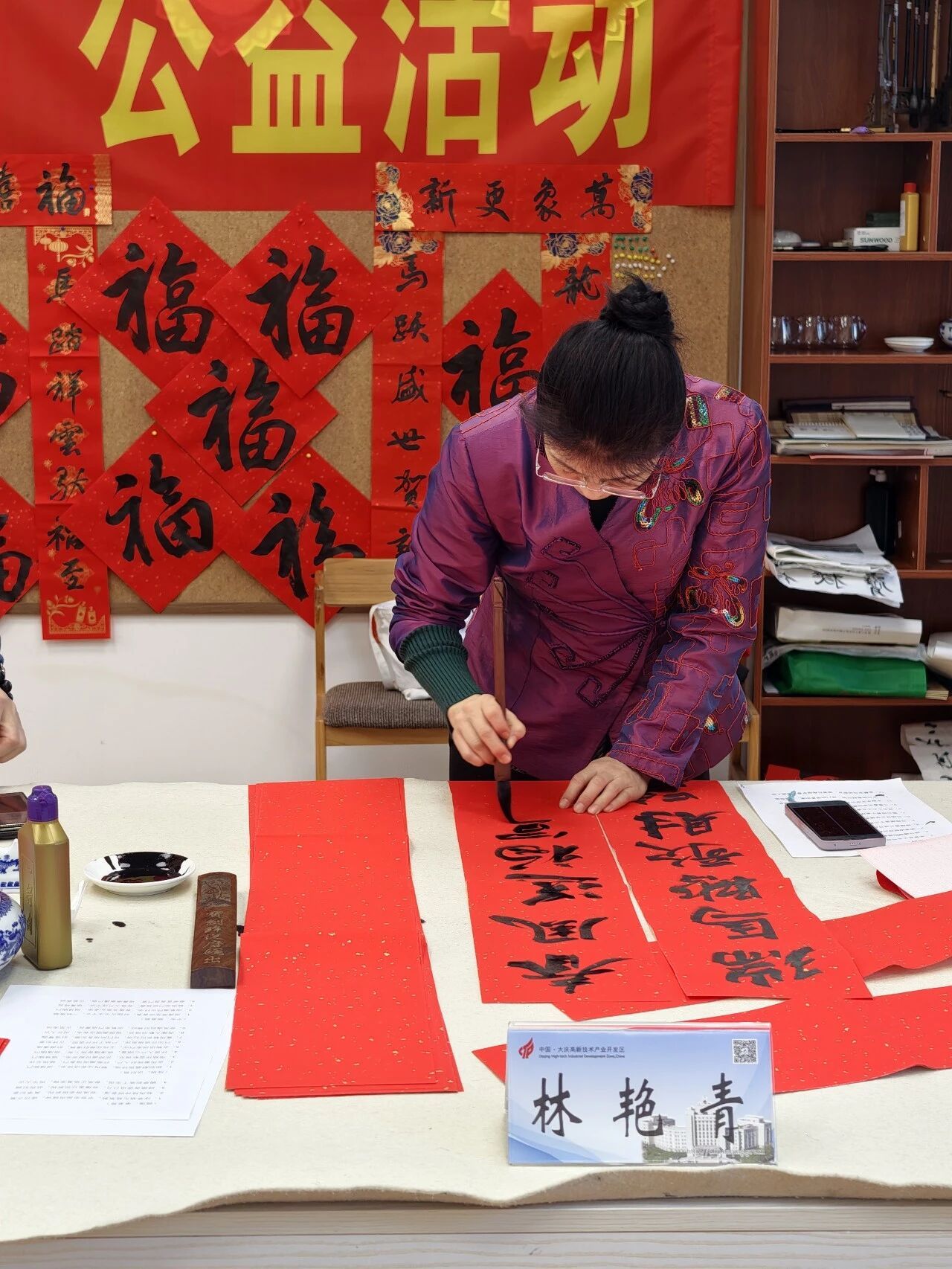 活動現場,年味十足,氣氛熱烈,書法家們神采奕奕,佩戴著象征喜慶的紅圍巾。在簡短的開幕儀式后,大家鋪開紅紙,提起毛筆,寫下一份份新春祝福?!叭鹧┘t梅報早春,金鞍寶馬迎新歲”“山清水秀天地美,鳥語花香氣象新”……一副副春聯(lián)、一張張福字,承載著中國人千百年來“天增歲月人增壽,春滿乾坤福滿門”的樸素愿望,寄托了大慶高新區(qū)全體干部職工“民安國泰逢盛世,風調雨順頌華年”的家國情懷。