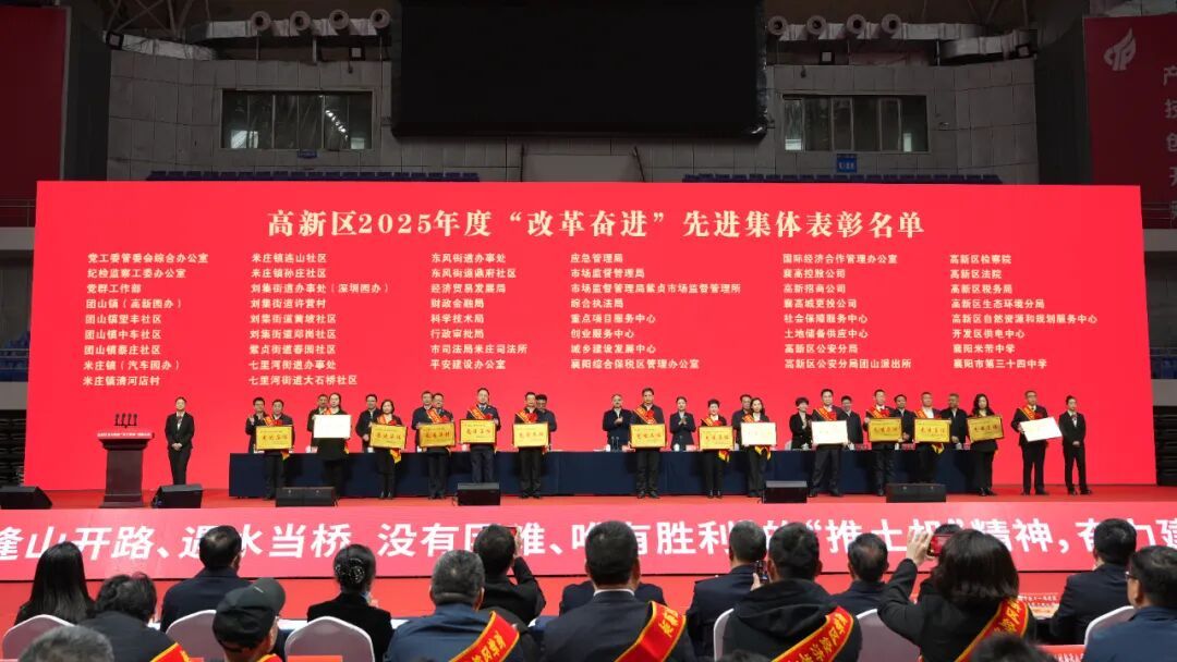 會(huì)議宣讀了襄陽高新區(qū)對(duì)2025年度經(jīng)濟(jì)高質(zhì)量發(fā)展作出突出貢獻(xiàn)的企業(yè)、優(yōu)秀建設(shè)項(xiàng)目以及“改革奮進(jìn)”先進(jìn)集體和先進(jìn)個(gè)人的表揚(yáng)通報(bào),并為獲獎(jiǎng)代表頒獎(jiǎng)。東風(fēng)康明斯發(fā)動(dòng)機(jī)有限公司、宇昂科技有限公司、楚能襄陽新能源電池項(xiàng)目、中國(guó)工商銀行襄陽高新區(qū)支行、襄陽高新區(qū)米莊鎮(zhèn)(汽車園辦)、襄陽高新區(qū)經(jīng)濟(jì)貿(mào)易發(fā)展局、襄高控股發(fā)展有限公司、襄陽高新區(qū)黨工委管委會(huì)綜合辦公室、清河店村、團(tuán)山社區(qū)等10家單位及個(gè)人代表作交流發(fā)言。