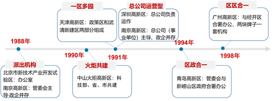 1988年,國務(wù)院批準實施火炬計劃,明確把創(chuàng)辦高新區(qū)作為火炬計劃的重要內(nèi)容;同年,批準建立第一個國家高新區(qū)——北京市新技術(shù)產(chǎn)業(yè)開發(fā)試驗區(qū)(以下簡稱“北京試驗區(qū)”),也就是中關(guān)村科技園區(qū)的前身,批準頒布《北京市新技術(shù)產(chǎn)業(yè)開發(fā)試驗區(qū)暫行條例》,拉開了我國建設(shè)國家高新區(qū)的序幕。北京市政府根據(jù)該《暫行條例》發(fā)布實施細則,明確規(guī)定北京市試驗區(qū)辦公室是海淀區(qū)人民政府的派出機構(gòu) ,在海淀區(qū)人民政府領(lǐng)導(dǎo)和市科委指導(dǎo)監(jiān)督下,具體辦理新技術(shù)企業(yè)的審批核定事宜。同年7月,為加強對北京試驗區(qū)的領(lǐng)導(dǎo)和協(xié)調(diào)工作,北京市政府牽頭組建了北京試驗區(qū)協(xié)調(diào)委員會 ,由北京市副市長任委員會主任,北京試驗區(qū)辦公室兼協(xié)調(diào)委員會辦公室職能。北京試驗區(qū)的建設(shè)模式為后來國家高新區(qū)組建領(lǐng)導(dǎo)小組,成立作為政府派出機構(gòu)的管委會奠定了重要基礎(chǔ)。在中關(guān)村科技園區(qū)成功探索的基礎(chǔ)上,1991年和1992年,國務(wù)院先后批準建立了51家國家高新區(qū),全面啟動國家高新區(qū)建設(shè)。為貫徹落實黨中央、國務(wù)院的指示精神,1991年,原國家科委和國家體改委研究制定了《關(guān)于深化高新技術(shù)產(chǎn)業(yè)開發(fā)區(qū)改革,推進高新技術(shù)產(chǎn)業(yè)發(fā)展的決定》,進一步明確了國家高新區(qū)改革的基本方向、原則和思路,明確國家高新區(qū)要根據(jù)發(fā)展社會主義有計劃商品經(jīng)濟的要求,建立起符合商品經(jīng)濟運行規(guī)律,適應(yīng)高新技術(shù)產(chǎn)業(yè)發(fā)展要求和國際慣例的體制、機制;各開發(fā)區(qū)要因地制宜地建立決策、管理機構(gòu),賦予相應(yīng)的權(quán)限,代表當(dāng)?shù)卣惺剐姓殭?quán), 統(tǒng)一對內(nèi)對外,集中有效地協(xié)調(diào)解決開發(fā)區(qū)發(fā)展中的重大問題,并在工商、稅務(wù)、財政、金融、國際合作交流、外貿(mào)、進出口等方面形成配套、高效的服務(wù)功能,為企業(yè)提供綜合服務(wù)。在1988年到2000年的“一次創(chuàng)業(yè)”階段,國家高新區(qū)發(fā)展到53家,成為我國高新技術(shù)的集聚地和成果轉(zhuǎn)化、產(chǎn)業(yè)發(fā)展的增長極。由于這一階段高新技術(shù)產(chǎn)業(yè)發(fā)展基礎(chǔ)總體薄弱,需要強有力的管理機構(gòu)創(chuàng)造發(fā)展環(huán)境,同時借鑒了當(dāng)時國家經(jīng)開區(qū)的管理經(jīng)驗,大多高新區(qū)采取較封閉的管理模式,探索集中授權(quán)管理。 初步形成了具有中國特色的“領(lǐng)導(dǎo)小組+管委會+公司” 管理架構(gòu),實行“決策層-管理層-服務(wù)層” 開放式管理模式。其中,“決策層”即由市政府主要負責(zé)人及市政府有關(guān)行政管理部門負責(zé)人組成的領(lǐng)導(dǎo)小組,為強化政府的作用,一般由市級主要領(lǐng)導(dǎo)擔(dān)任領(lǐng)導(dǎo)小組組長。主要負責(zé)宏觀決策、重大政策制定、用地規(guī)劃、協(xié)調(diào)解決高新區(qū)開發(fā)建設(shè)及管理過程中的重大問題等?!肮芾韺印奔醋鳛檎沙鰴C構(gòu)的管委會,代表當(dāng)?shù)卣惺拐殭?quán),對園區(qū)實行統(tǒng)一領(lǐng)導(dǎo),負責(zé)具體發(fā)展規(guī)劃、建設(shè)和管理等職責(zé)?!胺?wù)層”即設(shè)立園區(qū)開發(fā)建設(shè)公司、創(chuàng)新創(chuàng)業(yè)中心等,負責(zé)園區(qū)基礎(chǔ)設(shè)施建設(shè)、投融資、創(chuàng)業(yè)孵化等功能。實踐中,各國家高新區(qū)也結(jié)合自身實際情況,逐步探索適宜區(qū)域特征、順應(yīng)市場經(jīng)濟發(fā)展的多樣化管理體制 。如南京高新區(qū)創(chuàng)建初期采取以管委會為主導(dǎo)的政企并存模式;海南高新區(qū)、深圳高新區(qū)采取以企業(yè)、總公司為主導(dǎo)的管理體制;桂林高新區(qū)由具有一定行政職能的事業(yè)單位來實行企業(yè)管理;中山、廈門和威海三個國家高新區(qū),由原國家科委、省科委和當(dāng)?shù)卣限k,被命名為火炬高新區(qū),在行政管理的基礎(chǔ)上,成立開發(fā)總公司,負責(zé)高新區(qū)基礎(chǔ)設(shè)施建設(shè)、新技術(shù)產(chǎn)業(yè)投資和部分公共事務(wù)管理。