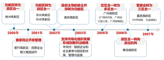 二、“二次創(chuàng)業(yè)”階段:深化“精簡、高效”改革,積極探索經(jīng)濟與社會統(tǒng)籌管理機制 進入21世紀,國內(nèi)外經(jīng)濟形勢發(fā)生巨大變化,中國加入WTO,科技創(chuàng)新成為我國發(fā)展主旋律。2001年,科技部在總結(jié)前一階段國家高新區(qū)建設(shè)經(jīng)驗的基礎(chǔ)上,研究提出了國家高新區(qū)“二次創(chuàng)業(yè)”的新任務(wù)和新目標,核心是要推進“五個轉(zhuǎn)變”, 從第一階段的外延式發(fā)展向更加依靠科技創(chuàng)新的內(nèi)涵式發(fā)展階段轉(zhuǎn)變,更加注重“創(chuàng)新驅(qū)動、內(nèi)生增長” 。2002年,科技部印發(fā)《關(guān)于國家高新區(qū)管理體制改革與創(chuàng)新的若干意見》,指出國家高新區(qū)要建立適應(yīng)社會主義市場經(jīng)濟要求和高新技術(shù)產(chǎn)業(yè)發(fā)展規(guī)律、符合WTO規(guī)則的管理體制和運行機制,國家高新區(qū)管理機構(gòu)要按照“精簡、高效、優(yōu)質(zhì)”的原則不斷推進職能轉(zhuǎn)變 ,進一步提高管理效率和靈活度?!岸蝿?chuàng)業(yè)”期間,國家高新區(qū)普遍加強了內(nèi)涵式和外延式相結(jié)合、引進大企業(yè)和培育小企業(yè)相結(jié)合的發(fā)展力度,不僅大力引進國內(nèi)外研發(fā)機構(gòu)、科教資源和龍頭企業(yè)進駐,而且著力營造創(chuàng)新創(chuàng)業(yè)氛圍,建設(shè)不同類型的科技企業(yè)孵化器,運用各種政策手段和市場力量,推動內(nèi)生發(fā)展動力的增長,形成了研發(fā)機構(gòu)密集、大企業(yè)和小企業(yè)和諧共生的產(chǎn)業(yè)鏈條。同時,國家高新區(qū)也不再是單純的產(chǎn)業(yè)園區(qū),而是形成了產(chǎn)城融合的具有現(xiàn)代化形象的科技新城和城市新地標, 不僅增強了創(chuàng)新活力和發(fā)展實力,而且提高了示范、輻射、引領(lǐng)和帶動作用,成為宜居宜業(yè)的創(chuàng)新創(chuàng)業(yè)高地,相應(yīng)也帶來諸多社會事務(wù)管理方面的新挑戰(zhàn) 。經(jīng)過十余年的發(fā)展,特別是產(chǎn)業(yè)規(guī)模的迅速擴大,部分國家高新區(qū)面臨空間緊缺的瓶頸,于是采用了不同方式,擴大管理范圍,拓展發(fā)展空間 。同時,現(xiàn)實中的不完全政府模式、不明晰職能邊界導(dǎo)致的矛盾日益凸顯,管理體制機制不順成為制約國家高新區(qū)創(chuàng)新發(fā)展重要因素。為此,國家高新區(qū)先后開啟了不同類型、不同程度的新一輪管理體制改革 。如株洲、青島、桂林、蘇州等高新區(qū)為解決空間不足、社會事務(wù)難以協(xié)調(diào)等問題,將高新區(qū)與行政區(qū)合并或建立新區(qū);上海紫竹采用多元化的股權(quán)結(jié)構(gòu),形成民營企業(yè)、高等院校、市區(qū)鎮(zhèn)政府“三結(jié)合”運營模式,成為全國首家以民營企業(yè)為開發(fā)主體的開發(fā)區(qū);廣州高新區(qū)進一步與新組建的蘿崗區(qū)合并,重慶高新區(qū)與沙坪壩區(qū)、九龍坡區(qū)等的鄉(xiāng)鎮(zhèn)街道合并實現(xiàn)擴容升級,等等;形成包括區(qū)區(qū)合一、政區(qū)合一和多區(qū)合一模式。
