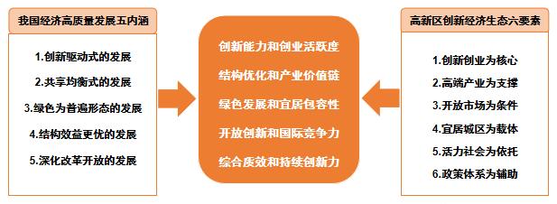 其中,“五大核心內(nèi)涵”著眼于“創(chuàng)新、協(xié)調(diào)、綠色、開放、共享”五大新發(fā)展理念,在發(fā)展動力上,強調(diào)創(chuàng)新是實現(xiàn)高質(zhì)量發(fā)展的第一動力,激發(fā)全社會創(chuàng)新潛能和創(chuàng)業(yè)活力;在發(fā)展支撐上,加快向提高供給體系質(zhì)量轉(zhuǎn)變,著力打造高質(zhì)量現(xiàn)代產(chǎn)業(yè)體系;在發(fā)展路徑上,提升全球拓展和競爭能力,形成高水平的全面開放新格局;在發(fā)展環(huán)境上,堅持以人為本、生態(tài)優(yōu)先、包容并蓄原則,營造滿足人民美好生活需要的環(huán)境;在發(fā)展績效上,強調(diào)創(chuàng)新對于發(fā)展的實際推動作用,突出高質(zhì)量發(fā)展的效率提升和經(jīng)濟成效。而“六大關(guān)鍵要素”源于創(chuàng)新經(jīng)濟生態(tài)模型和內(nèi)涵,國家高新區(qū)創(chuàng)新經(jīng)濟生態(tài)的營造,最終要形成以創(chuàng)新創(chuàng)業(yè)活動為核心、以高端產(chǎn)業(yè)為價值承載、以發(fā)達的市場網(wǎng)絡(luò)和空間為條件、以宜業(yè)宜居的城區(qū)為環(huán)境依托、以多元創(chuàng)業(yè)文化和人才組成的活力社會為要素支撐的開放和自組織的創(chuàng)新經(jīng)濟體系。這一生態(tài)構(gòu)成中,創(chuàng)新創(chuàng)業(yè)是核心觀察對象,政府政策為外部作用力,由此這也契合了學(xué)術(shù)界普遍采用的創(chuàng)新生態(tài)六要素模型,即:創(chuàng)新創(chuàng)業(yè)、產(chǎn)業(yè)、市場、文化、社會和政策。