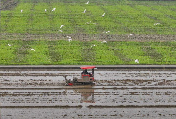 2025年2月25日,在浙江省瑞安市馬嶼鎮(zhèn)儒陽(yáng)村,農(nóng)機(jī)在田間犁地,白鷺低空而飛(無(wú)人機(jī)照片)。新華社發(fā)(蘇巧將攝)