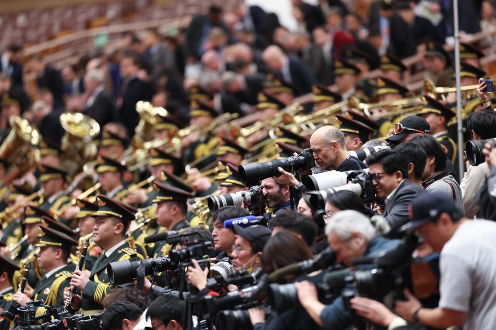3月4日,全國政協(xié)十四屆三次會議在北京人民大會堂舉行開幕會。這是軍樂團在演奏。