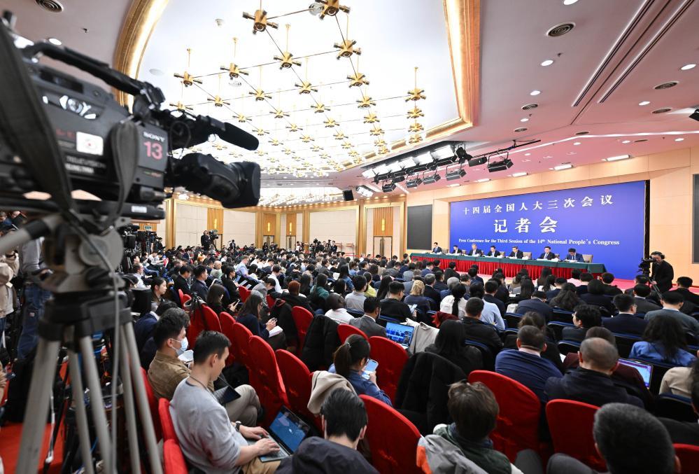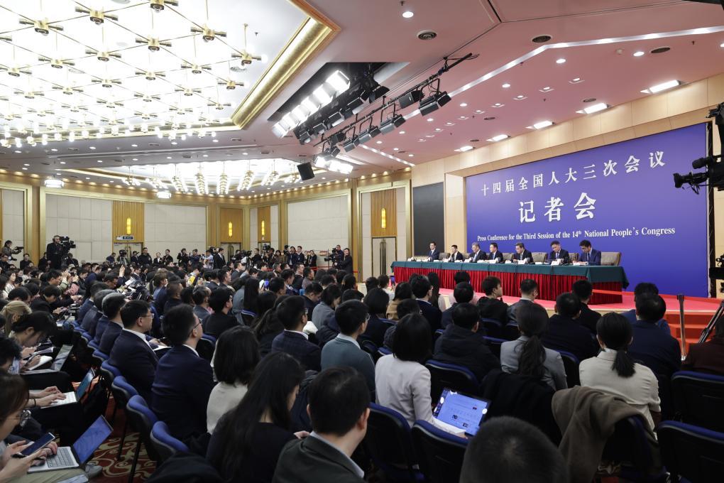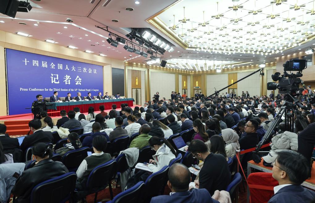 3月6日,十四屆全國(guó)人大三次會(huì)議在北京梅地亞中心新聞發(fā)布廳舉行記者會(huì)。國(guó)家發(fā)展和改革委員會(huì)主任鄭柵潔、財(cái)政部部長(zhǎng)藍(lán)佛安、商務(wù)部部長(zhǎng)王文濤、中國(guó)人民銀行行長(zhǎng)潘功勝、中國(guó)證券監(jiān)督管理委員會(huì)主席吳清就發(fā)展改革、財(cái)政預(yù)算、商務(wù)、金融證券等相關(guān)問題回答中外記者提問。這是新華社記者在提問。