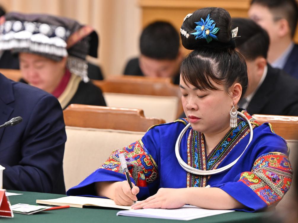3月6日,全國人大代表在十四屆全國人大三次會議貴州代表團(tuán)開放團(tuán)組會議上聽會。