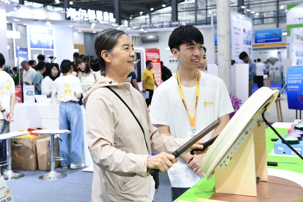 2024年10月27日,老人在2024深圳國(guó)際智慧養(yǎng)老產(chǎn)業(yè)博覽會(huì)上體驗(yàn)樂(lè)齡鼓。新華社記者 梁旭 攝