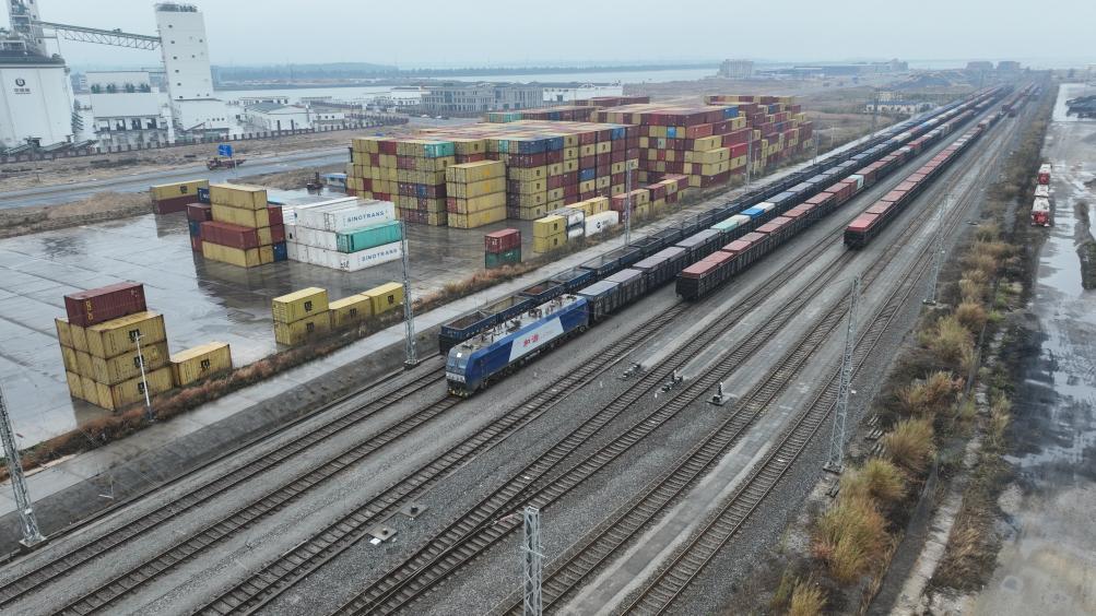 一趟滿載集裝箱貨物的西部陸海新通道鐵海聯(lián)運(yùn)班列,準(zhǔn)備從廣西欽州港東站駛出。新華社發(fā)