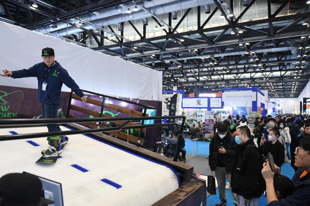 2023年2月11日,參觀(guān)者在展會(huì)上了解一款模擬滑雪設(shè)備。當(dāng)日,2023亞洲運(yùn)動(dòng)用品與時(shí)尚展在國(guó)家會(huì)議中心拉開(kāi)帷幕。新華社記者 張晨霖 攝
