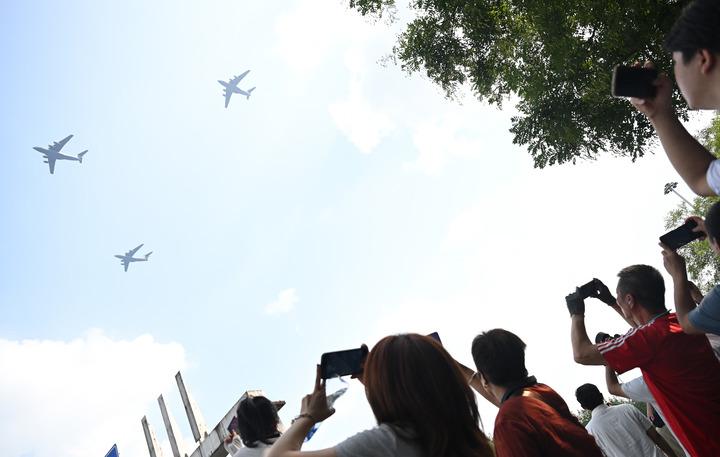 當(dāng)龐大的運(yùn)輸機(jī)機(jī)群飛過,天安門廣場上空沸騰起來——3架運(yùn)-20A、3架運(yùn)-20B運(yùn)輸機(jī)光榮接受祖國和人民檢閱。